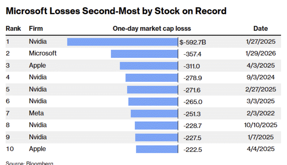 Microsoft. Zeitweise über Minus 12 % an einem Tag, über 350 Milliarden USD Marktkapitalisierung verdampft. Das ist der größte Tagesverlust seit DeepSeek NVIDIA im Januar traf.