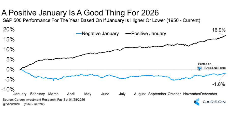 76 Jahre Daten, durchschnittlich 8,2 % Gewinn über die restlichen elf Monate, Median bei 9,9 %. Das Januar-Barometer funktioniert, weil es Sentiment einfängt. Aber 13 % der Fälle gehen trotzdem schief.