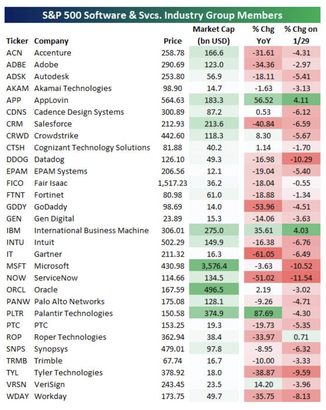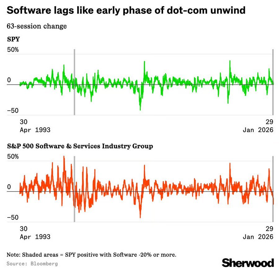 Der Software-Sektor (IGV) fiel wegen der Microsoft-/Servicenow-/SAP-Panik um über 5 % und rutscht 20 % unter sein Oktober-Hoch. Also ein technischer Bärenmarkt. Während Semis und Hardware glänzen, liegt der Tech-Bereich am Boden.