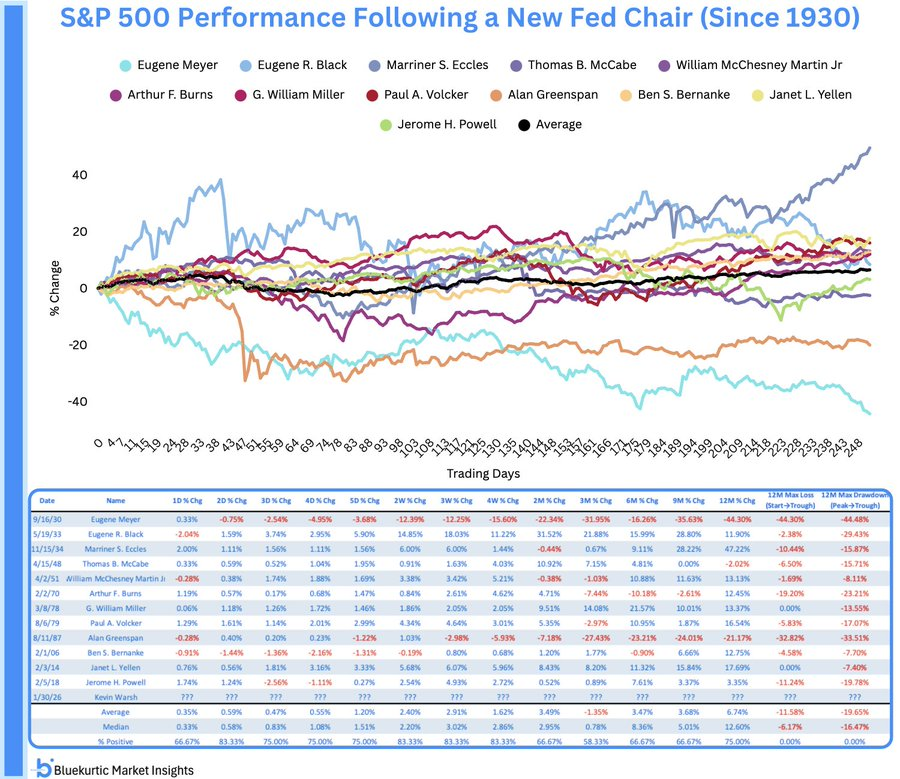 Historisch performte der Markt nach neuen Chairs gut, weil Wechsel oft in ruhigeren Zeiten stattfanden. Warsh ist ein Falke, bekannt für harte Geldpolitik. Wenn er tatsächlich die Zinsen länger hochhält oder sogar erhöht, könnten bald die ersten verbalen Gefechte mit Trump folgen. Aber der wird sich schon etwas dabei gedacht haben. Denke ich mal.