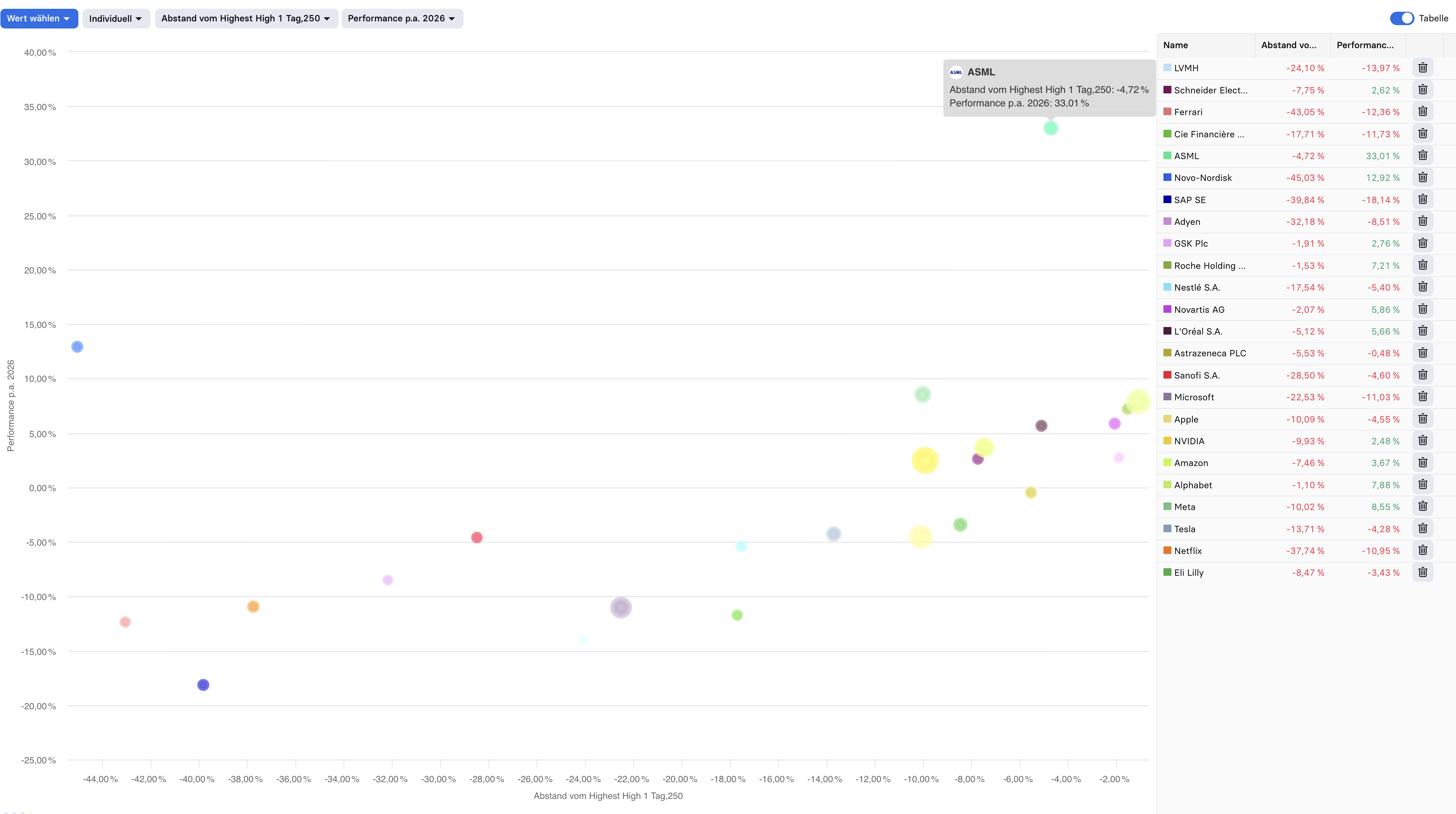 📌 Abstand vom 52W Hoch vs. Performance in 2026 für Mag7+Granolas+Super7