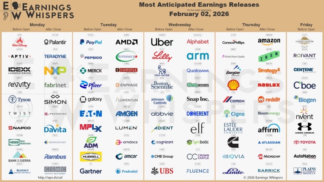 Der Chart vergleicht drei Gold-Bullenmärkte, normiert auf den Preis im August 2018. Die türkise Linie zeigt Bullenmarkt Nr. 1 von 1971 bis 1980. Ein Plus von 2.566 %. Die lila Linie ist Nummer 2 von 1999 bis 2011. Er endete mit 780 %. Der grüne Verlauf ist Bullenmarkt 3 (Start im August 2018, aktuell bei etwa 7,5 Jahren). "Nur" ein Plus von bis zu 418 %. Dennoch hat Gold am Freitag in 24 Stunden 6,3 Billionen USD Marktkapitalisierung verloren. Ein historischer Ausverkauf, der zeigt, dass selbst die sicheren Häfen zittern, wenn die Liquidität schwindet und Positionierungen zu einseitig werden. Jetzt wird spannend, wie die Zahlen von Alphabet und Amazon am Mittwoch bzw. Donnerstag aufgenommen werden. Schnallt euch an!