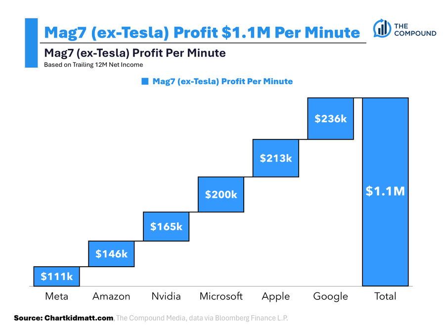 Zusammen erwirtschaften Meta, Amazon, Nvidia, Microsoft, Apple und Google (ohne Tesla) derzeit rund 1,1 Million US-Dollar Nettogewinn pro Minute. Allein Google und Apple tragen davon fast die Hälfte bei.
