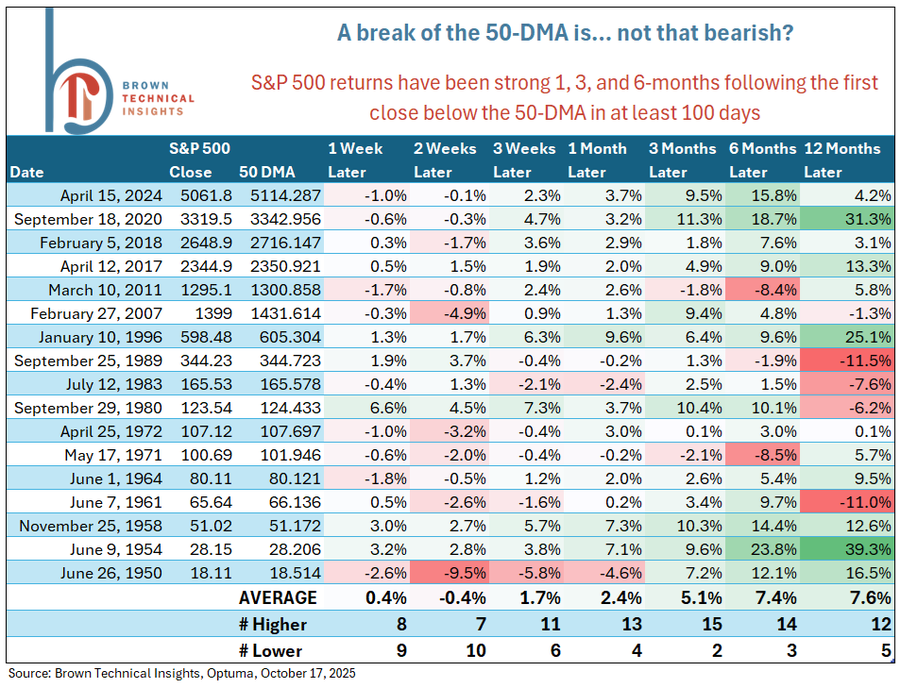 Wenn der S&P 500 nach mindestens 100 Handelstagen erstmals wieder unter seine 50 Tagelinie fällt, ist das historisch betrachtet selten ein bärisches Signal. Kurzfristig folgt oft eine leichte Schwächephase. Im Durchschnitt ein Minus von rund 0,4 % in den folgenden zwei Wochen. Doch auf Sicht von drei bis sechs Monaten dreht das Bild: In 15 von 17 Fällen lag der Index danach im Plus, mit durchschnittlichen Gewinnen von über 5 % nach drei und mehr als 7 % nach sechs Monaten.