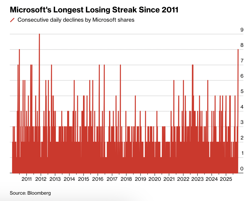 Die Grafik von Bloomberg zeigt, dass Microsoft aktuell die längste Verlustserie seit dem Jahr 2011 verzeichnet. 8 Handelstage in Folge im Minus.