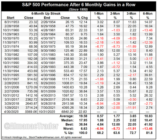 Die Statistik von StockTradersAlmanac zeigt, dass eine sechsmalige Monatsrally im S&P 500 selten das Ende eines Aufwärtstrends markiert. Seit 1950 kam es 22x zu einer solchen Serie und in rund 68 % der Fälle legte der Index auch im 7. Monat weiter zu, im Median um 1,9 %. Zwar folgten auf kurze Sicht teils Konsolidierungen, nach sechs Monaten stand der Markt jedoch im Schnitt 8 % höher.