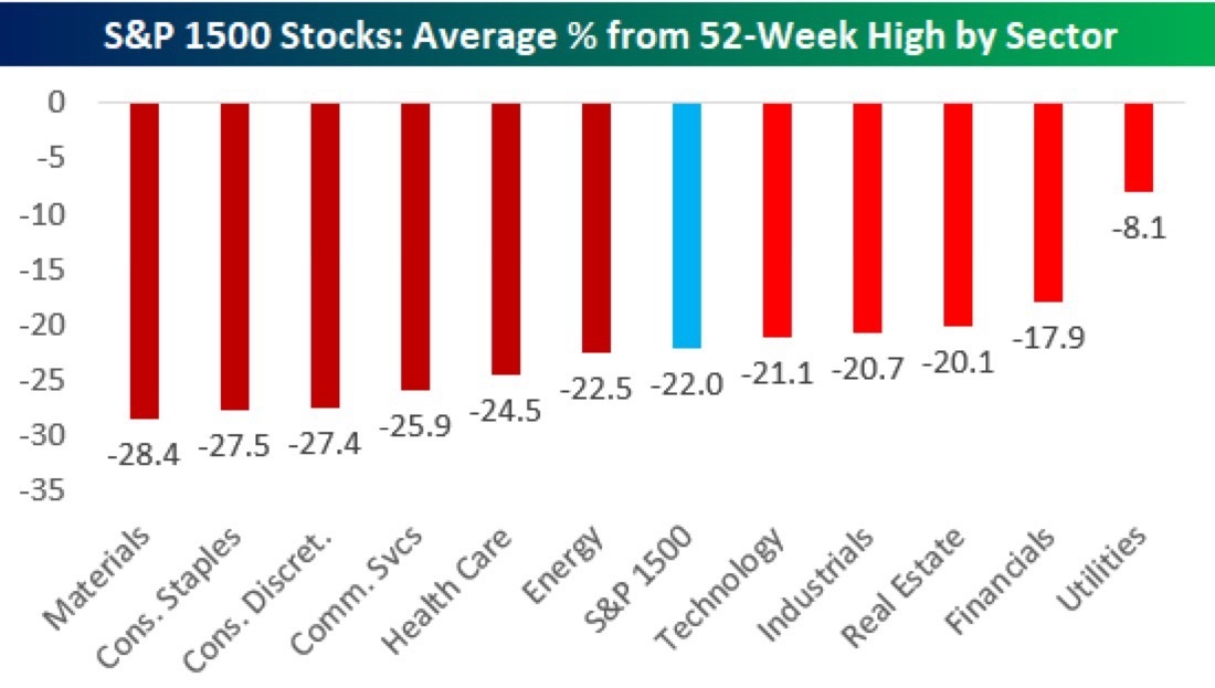 Die Grafik von Bespoke zeigt, dass die Durchschnittsaktie im S&P 1500 aktuell rund 22 % unter seinem 52-Wochen-Hoch notiert. Besonders schwach präsentieren sich Materials, Consumer Staples, Discretionary und Communication Services, die allesamt mehr als 25 % vom Hoch entfernt sind. Nur Versorgeraktien zeigen relative Stärke und liegen im Schnitt lediglich 8 % unter ihren Hochs.