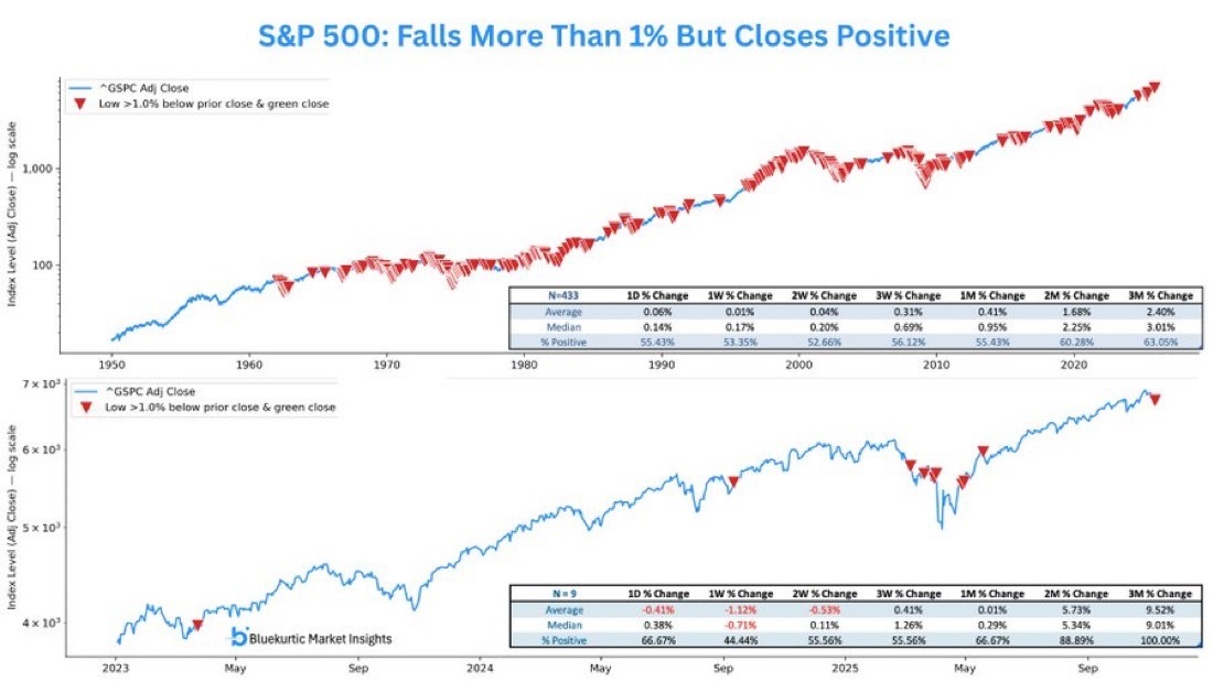 Der S&P 500 ist seit 1950 insgesamt 434x intraday um mehr als 1 % gefallen, aber hat den Handelstag dennoch im Plus beendet. Am Freitag zum 10. Mal seit 2023. Historisch folgten auf solche „Shakeouts“ meist weitere Kursanstiege: Drei Monate später lag der Index in 63 % der Fälle höher, seit 2023 sogar in 100 % der Beobachtungen.