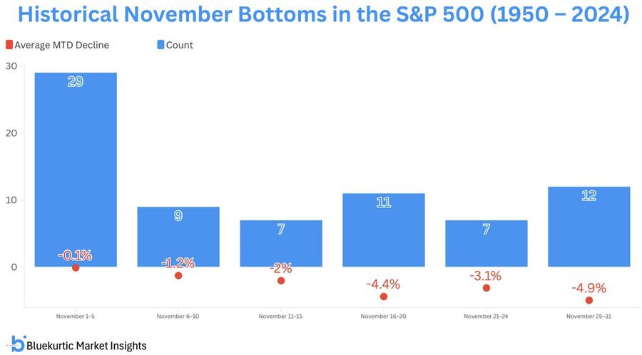 Seit 1950 wurde der Tiefpunkt des S&P 500 im November in 29 von 75 Jahren innerhalb der ersten fünf Handelstage markiert. Häufiger als in jeder anderen Monatsphase. Statistisch markiert dieser oft den Wendepunkt vor einer typischen Jahresendrally.