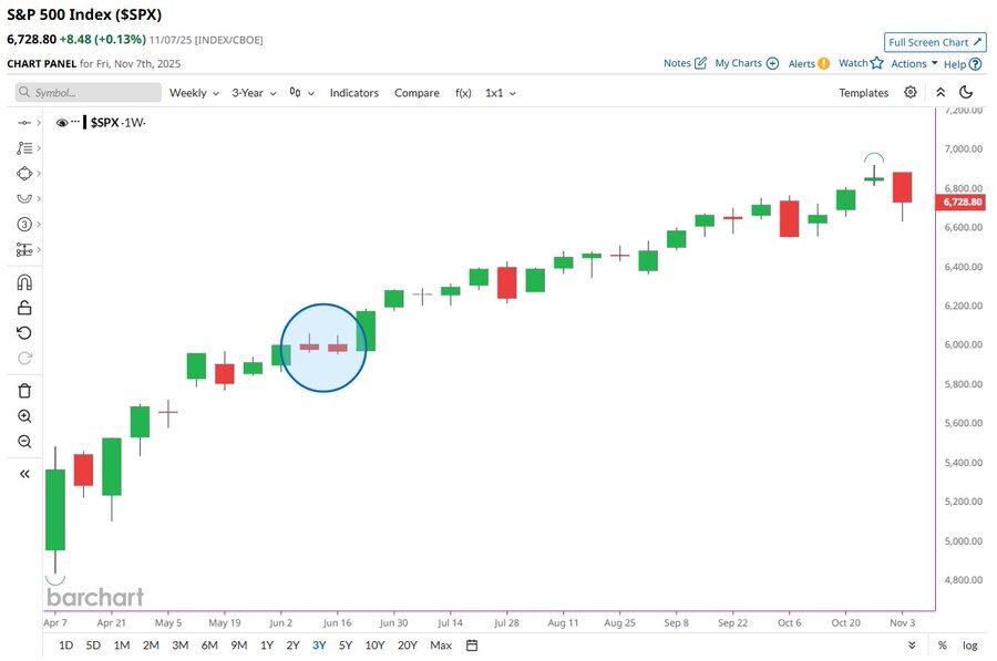 Der Chart macht deutlich, wie robust der Aufwärtstrend im S&P 500 seit dem Frühjahr verläuft. Seit April gab es lediglich einmal – im Juni – zwei aufeinanderfolgende Wochenverluste