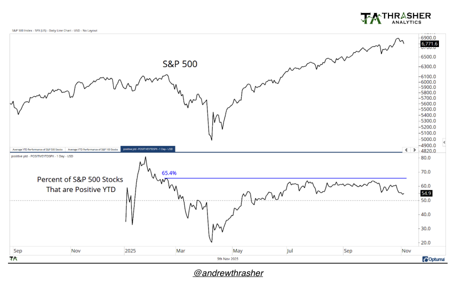 Während der Index nur wenige Prozent unter seinem Allzeithoch notiert, befinden sich aktuell nur rund 55 % der Einzelwerte im Plus seit Jahresbeginn. Zum Vergleich: Vor dem Rücksetzer im März/April lag dieser Anteil bei 65 %.