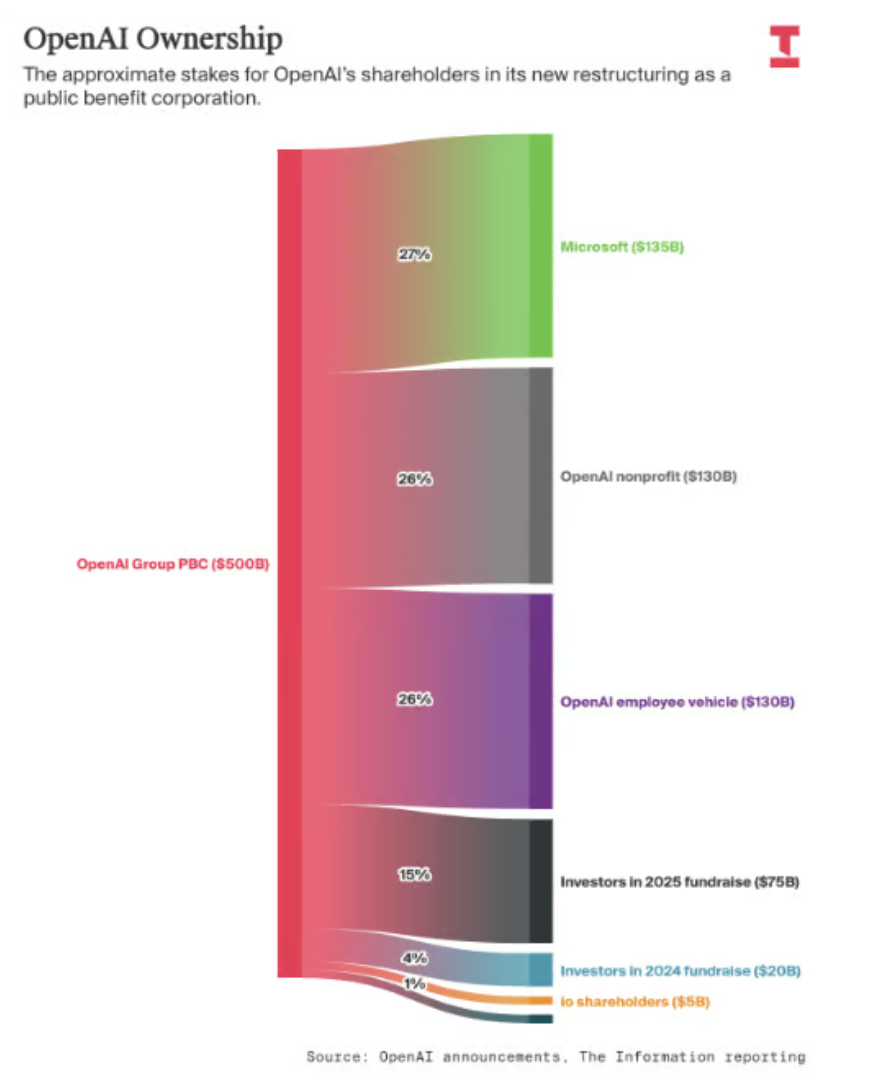 Die Grafik von The Information zeigt die neu gestaltete Eigentümerstruktur von OpenAI nach der Umwandlung in eine Public Benefit Corporation mit einer Gesamtbewertung von rund 500 Mrd. US-Dollar.