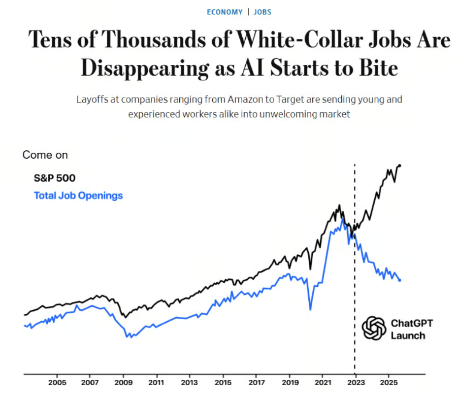 Seit dem Launch von ChatGPT Ende 2022 steigt der S&P 500 weiter an, während die Zahl offener Stellen in den USA deutlich sinkt. Besonders betroffen sind gut bezahlte White-Collar-Jobs, die zunehmend durch KI und Automatisierung ersetzt werden.
