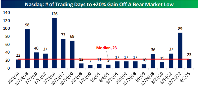 Wie lange hat der Nasdaq in der Vergangenheit gebraucht, um sich nach einem Bärenmarkttief um 20 % zu erholen? Der jüngste Fall – mit exakt 23 Handelstagen bis zum +20 %-Anstieg – liegt dabei exakt im historischen Median.