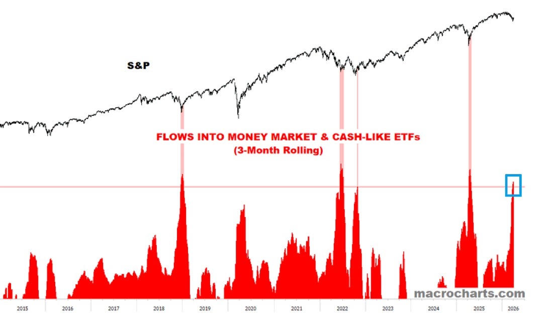 Der S&P 500 hat nur einen Mini-Rücksetzer gezeigt (im Schnitt sind es 14 % Drawdown p.a.), trotzdem sind die Zuflüsse in Geldmarktfonds und cashähnliche ETFs im Drei-Monats-Fenster auf ein Extrem gestiegen.