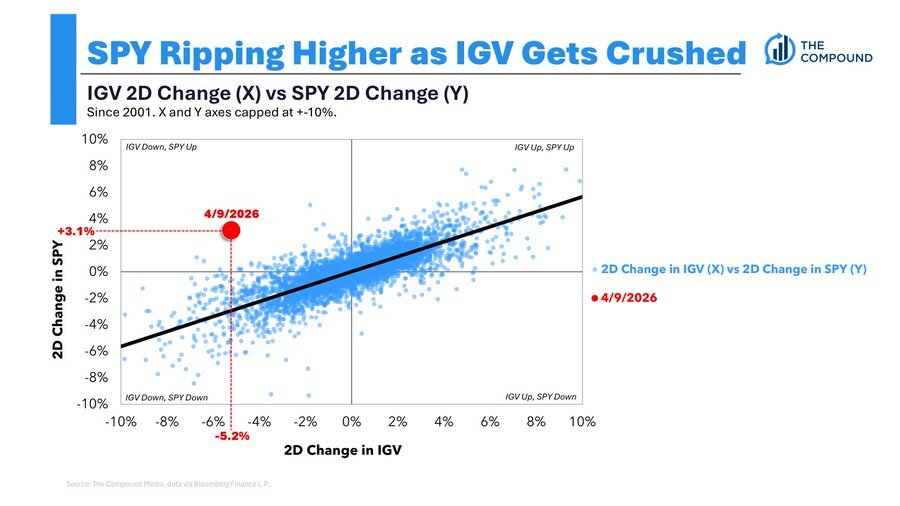 In nur zwei Tagen gewann der S&P500 über 3,1 %, während der Software-ETF IGV im selben Zeitraum über 5,2 % verlor. Normalerweise läuft Software bei einer starken Index-Erholung eher mit oder sogar stärker.