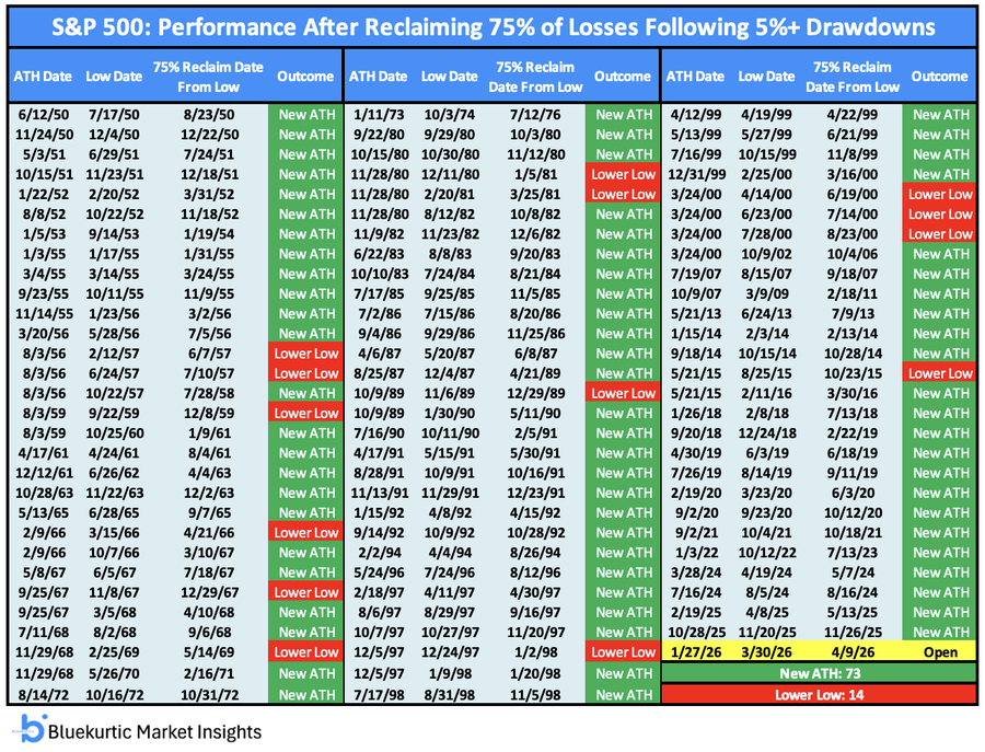 📌 Wer 75 % eines 5 % Drawdowns zurückholt, macht historisch häufiger neue Hochs als neue Tiefs