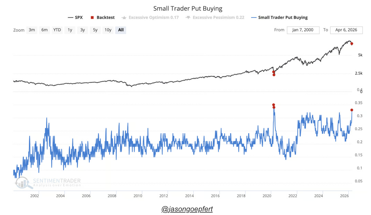 Die Absicherung bei Privatanlegern war absurd hoch. Der Anteil neuer Put-Käufe lag klar über dem normalen Bereich und bewegte sich nahe an früheren Stressphasen wie 2020.