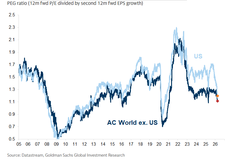 Auch die USA werden beim Verhältnis von Bewertung zu erwartetem Wachstum inzwischen fast ähnlich bewertet wie der Rest der Welt ohne die USA.