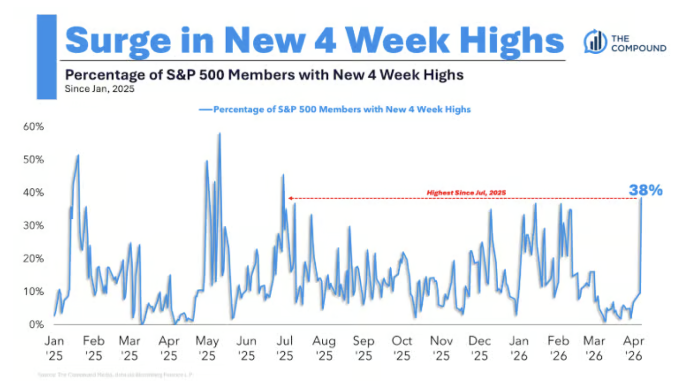 Zuletzt stieg der Anteil der S&P 500 Aktien mit neuen 4W-Hochs auf 38 %. Das ist der höchste Wert seit Juli 2025.