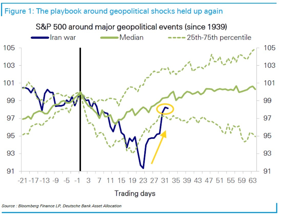 Der Markt hat genau das gemacht, was er historisch in solchen Phasen häufig zeigt. Er dreht nicht dann, wenn sich die Nachrichtenlage verbessert, sondern dann, wenn die Unsicherheit ihren Höhepunkt erreicht. Bei geopolitischen Schocks zeigt die Historie ein klares Muster.