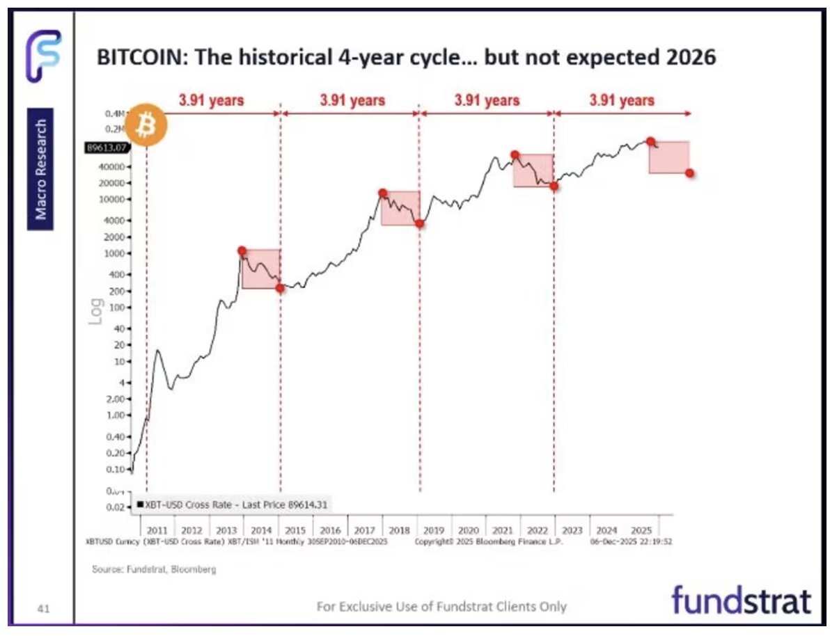 Tom Lee hat auch eine Bitcoin-Grafik, die den historischen 4-Jahres-Zyklus der Kryptowährung darstellt und den charakteristischen Drawdowns (rot markiert). Allerdings betont er, dass er diesen Zyklus für 2026 nicht erwartet.