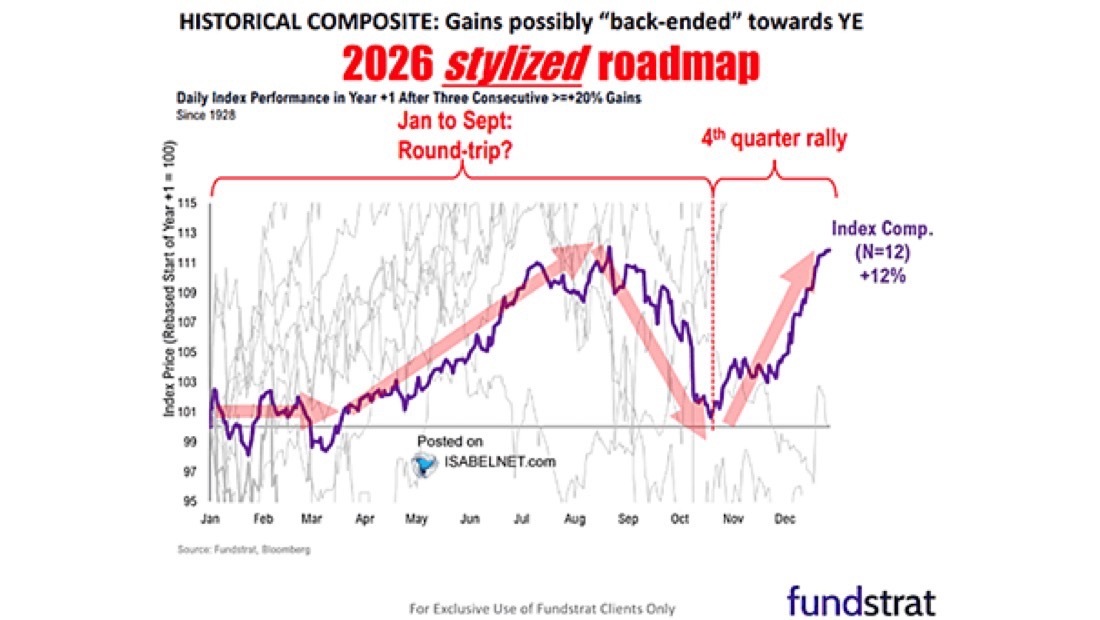 Historisch betrachtet widerlegt Lee die Sorge, dass nach drei aufeinanderfolgenden Jahren mit 20 %+ Gewinnen eine Pause fällig sei: Seit 1928 legte der S&P 500 im vierten Jahr nach solchen Läufen durchschnittlich weitere 12% zu.