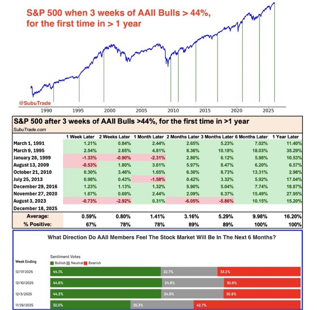 Wenn die AAII-Umfrage drei Wochen in Folge mehr als 44% Bullen aufweist (Bedingung: zum ersten Mal seit über einem Jahr) folgt historisch eine überwiegend positive Performance. Aktuell ist genau diese Konstellation am 18. Dezember 2025 eingetreten, nach der letzten vergleichbaren Phase im August 2023.