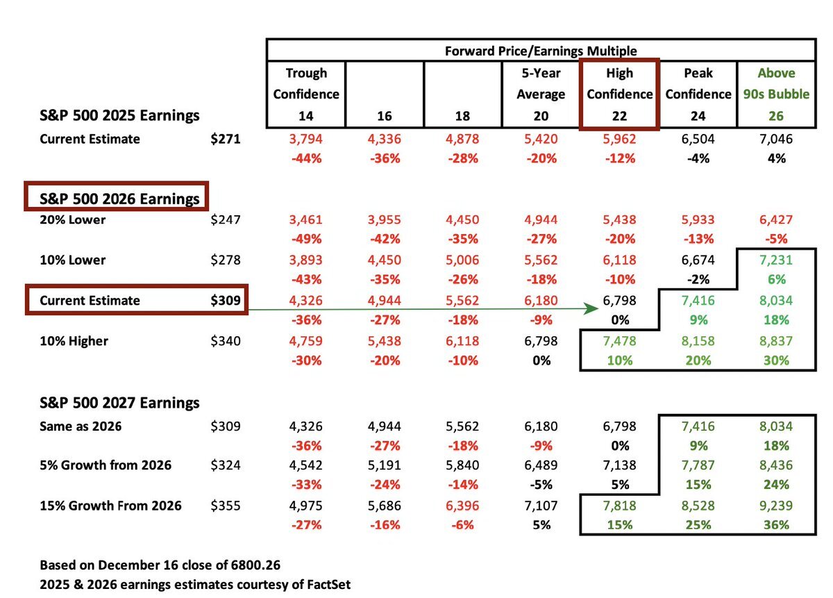 - Bei den aktuellen 2026er Gewinnschätzungen von $309 und einem KGV von 22x ergibt sich ein fairer Wert von 6.798. Praktisch exakt dort, wo der Markt heute handelt (grüner Pfeil). Das bedeutet: Der S&P 500 ist weder über- noch unterbewertet, wenn man von "High Confidence" in die Gewinnschätzungen und einer historisch leicht erhöhten, aber nicht extremen Bewertung ausgeht.