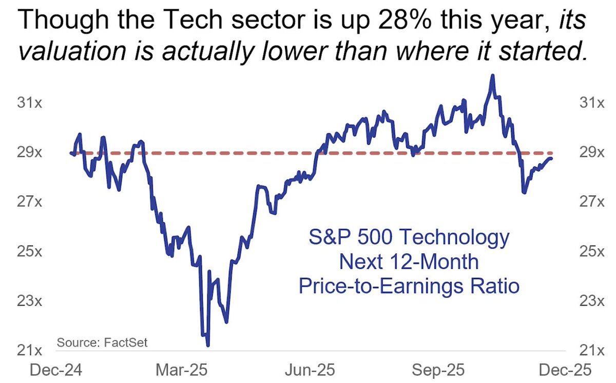 Die Grafik von FactSet entlarvt das Narrativ der Tech-Blase als Mythos: Obwohl der Tech-Sektor im S&P 500 dieses Jahr um 28 % gestiegen ist, liegt das Forward KGV aktuell bei etwa 29x. Das ist niedriger als zu Jahresbeginn bei ebenfalls rund 29x. Was ist passiert? Die Gewinnerwartungen sind schneller gestiegen als die Kurse.