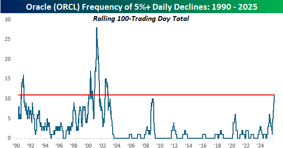 Die Grafik zeigt die rollierende Anzahl von Handelstagen mit Kursverlusten von mehr als 5 % bei Oracle innerhalb von jeweils 100 Handelstagen seit 1990. Der aktuelle Wert reicht nahe an das historische Maximum heran und liegt damit über dem Niveau vergleichbarer Zeiträume während der Finanzkrise.