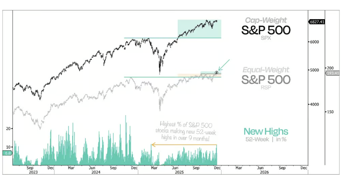Der Vergleich zwischen dem Cap-Weight S&P 500 und dem Equal-Weight S&P 500 zeigt dabei eine interessante Divergenz: Während der klassische, nach Marktkapitalisierung gewichtete Index Ende noch kein neues ATH gemacht hat, hat der Equal-Weight Index weitgehend seitwärts notiert, ist aber nun ausgebrochen.