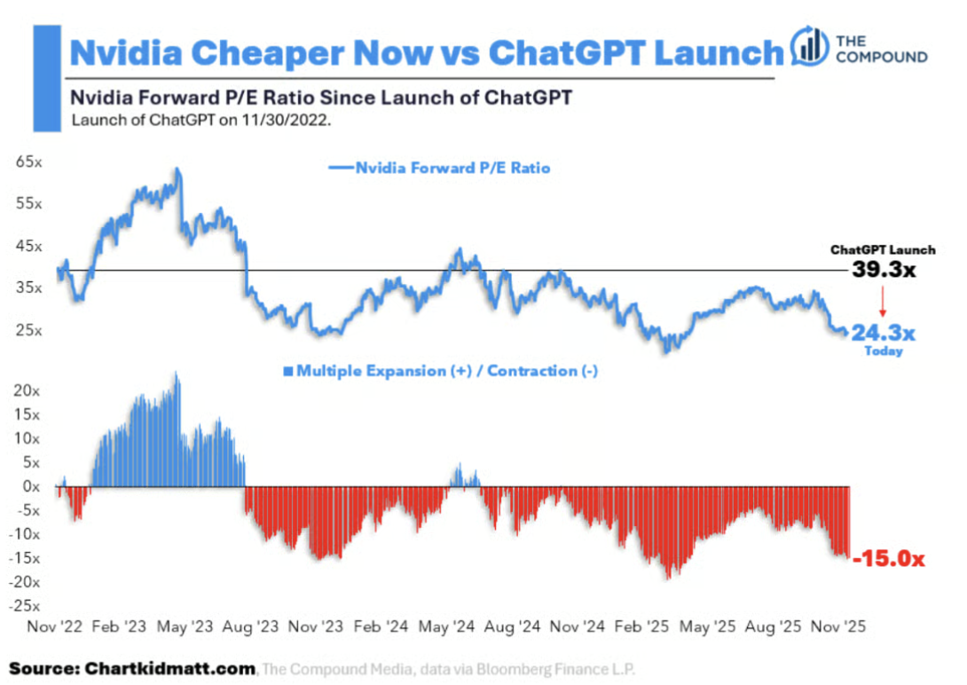 Nvidias Forward KGV liegt aktuell bei 24,3x und damit deutlich unter dem Niveau von 39,3x zum Launch von ChatGPT am 30. November 2022. Trotz Nvidias Rolle als zentraler Enabler dieser Revolution ist die Aktie relativ zu den Gewinnerwartungen um 38 % günstiger geworden.