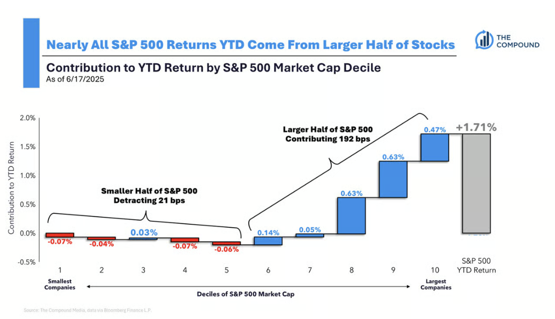 Die untere Hälfte des Index – also die kleineren 250 Werte – haben per saldo negativ zur Jahresperformance beigetragen und sogar 21 Basispunkte Rendite gekostet. Die gesamte Performance von +1,71 % kommt ausschließlich von der größeren Hälfte, insbesondere aus dem obersten Marktkapitalisierungs-Dezil, das allein 0,63 % beisteuerte.