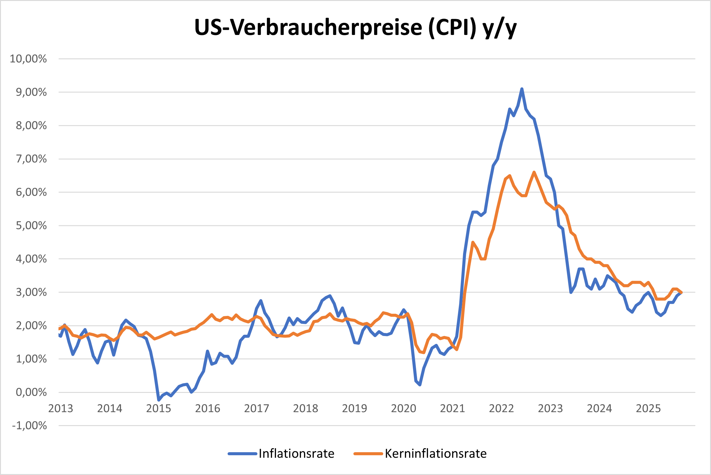 Am Freitagnachmittag wurden die mit Spannung erwarteten US-Inflationsdaten für September veröffentlicht, die wegen des Shutdowns in den USA bisher nicht publiziert werden konnten. Wie die Daten zeigen, hat sich die Teuerung im vergangenen Monat zwar etwas beschleunigt, aber nicht so stark wie erwartet.