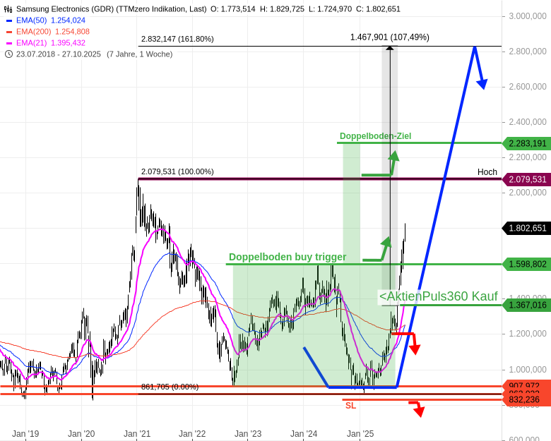 Samsung ergibt sich nicht intuitiv, aber AktienPuls360 fand heraus, das da was gehen könnte. Unser Kauf war zu 1367 USD.