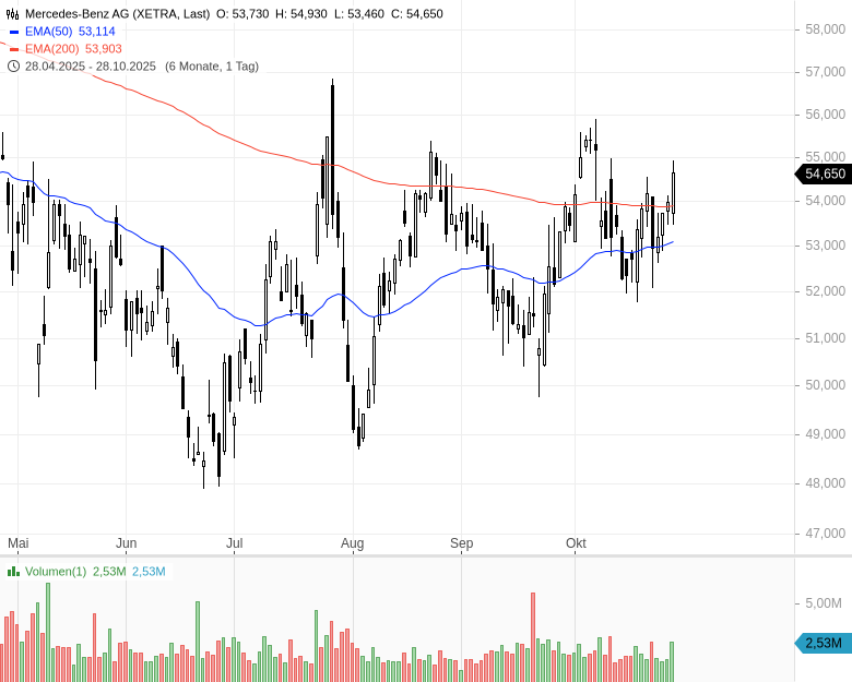 Bei den Analysten blieb die Reaktion verhalten. JPMorgan bestätigte das Rating "Overweight“ mit einem Kursziel von 68 EUR und lobte die "robuste Profitabilität trotz globaler Zoll- und Konjunkturbelastungen“. Die Analysten von RBC zeigten sich vorsichtiger und beließen Mercedes-Benz auf "Sector Perform“ mit einem Kursziel von 54 EUR. Der unveränderte Ausblick, so die Kanadier, werfe die Frage auf, ob das Management bewusst konservativ plane oder sich die Markterwartungen für das Schlussquartal nach unten anpassen müssten.