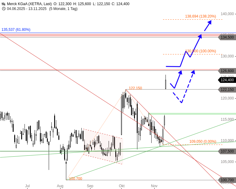 Der heutige Kurssprung reißt ein großes Aufwärts-Gap. Die Aktie markierte ihren ersten Kurs erst oberhalb des Hochs vom 6. Oktober bei 122,15 EUR. Damit ist ein weiteres Kaufsignal aktiv.