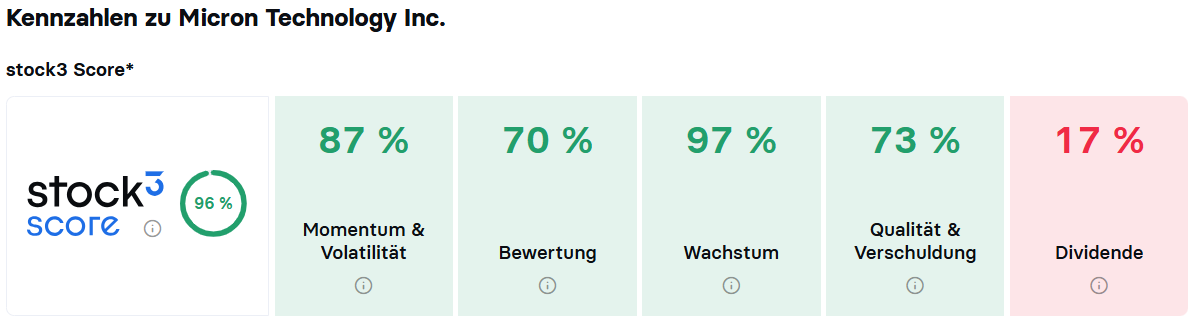 Mit 96 % schneidet Micron Technology auch im stock3 Score überragend gut ab. Punkten kann Micron Technology vor allem mit dem hohen Umsatz- und Gewinnwachstum, dem positiven Kursmomentum, einer guten Bilanz- und Ergebnisqualität sowie mit einer relativ günstigen Bewertung.