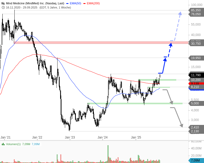 Fazit: Die Mind-Medicine-Aktie zeigt aktuell Stärke und Angriffslust. Bleiben die Käufer jetzt dran und schicken den Wert über das 2024er-Hoch, könnte ein größerer Rallyabschnitt folgen.
