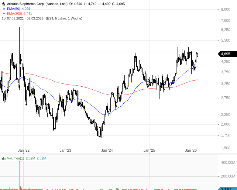 - Arbutus Biopharma Corp. - WKN: A14XMD - ISIN: CA03879J1003 - Kurs: 4,695 $ (Nasdaq)