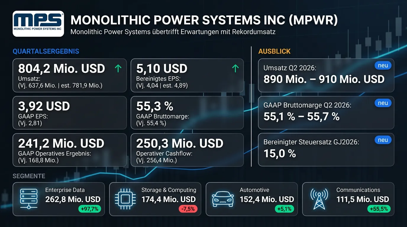 Monolithic Power Systems (MPS) hat im ersten Quartal 2026 einen Rekordumsatz von 804,2 Mio. USD erzielt und damit sowohl die Analystenerwartungen als auch den Vorjahreswert deutlich übertroffen. Das bereinigte EPS von 5,10 USD lag ebenfalls über dem Konsens von 4,89 USD. Besonders stark wuchs das Enterprise-Data-Segment dank höherer Nachfrage nach KI- und Server-Lösungen um 97,7 Prozent gegenüber dem Vorjahr. Für das zweite Quartal 2026 kommuniziert das Unternehmen erstmals eine Umsatzprognose von 890 bis 910 Mio. USD.
