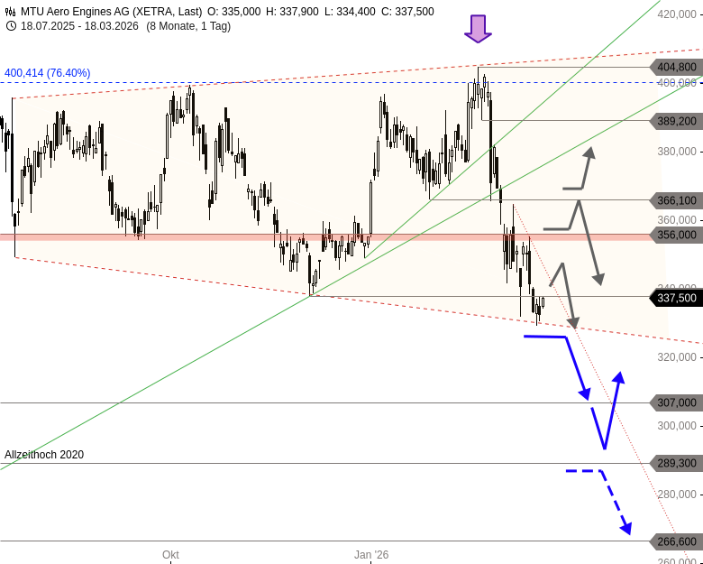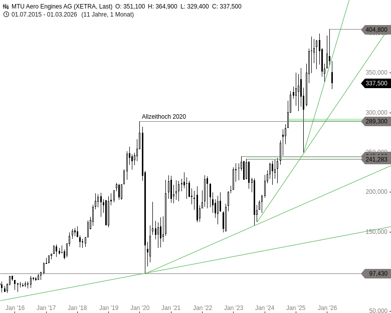 Die Aktie von MTU war im Rahmen des allgemeinen Markt-Abverkaufs im Frühjahr 2025 fast an die Supportzone um 245 EUR eingebrochen. Ausgehend von einem Tief bei 249,60 EUR setzte sich der übergeordnete Aufwärtstrend der Aktie allerdings wieder in Bewegung und führte sogar über das damalige Rekordhoch bei 356,00 EUR.