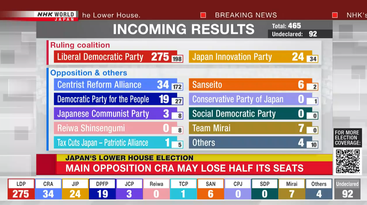 Zusammen mit dem Koalitionspartner Japan Innovation Party dürfte es künftig sogar zu einer Zwei-Drittel-Mehrheit reichen, wie Projektionen zeigen. Mit einer Zwei-Drittel-Mehrheit könnte die Regierungskoalition auch Entscheidungen der zweiten Parlamentskammer, des japanischen Oberhauses, überstimmen.