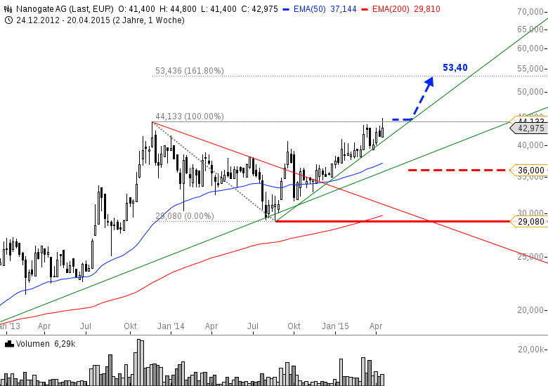 Die Finanzkraft stärkte Nanogate im März. Knapp 300.000 Aktien wurden zu 39,00 € je Aktie bei "ausgewählten qualifizierten und langfristig orientierten institutionellen Investoren im In- und Ausland", so die Meldung platziert. Brutto nahm Nanogate dadurch 11,6 Mio. € ein. 17,8 Mio. € hatte Nanogate Ende 2014 in der Kasse. Das Management will eine kleine Dividende von 0,11 € je Aktie an die Anteilseigner ausschütten.