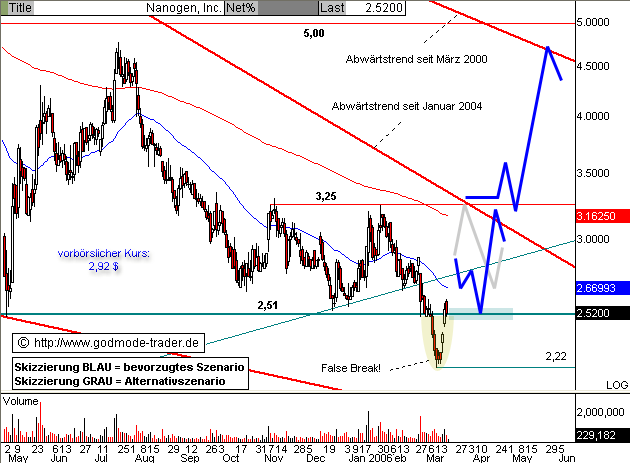 Diagnose: Die NANOGEN Aktie rutschte Anfang März unter die wichtige Unterstützung bei 2,51 $ zurück und generierte damit ein kurzfristiges Verkaufsignal. Nach einem ersten Zwischentief bei 2,22 $ drehte die Aktie wieder nach oben, um den obligatorischen Pullback (Rücksetzer) an die 2,51 $ Marke zu vollziehen. Am 14.03.2006 sprang die Aktie aber unter hohen Umsätzen zurück über die 2,51 $ Marke, womit das Verkaufsignal vorerst neutralisiert wurde. Heute steigt die NANOGEN Aktie vorbörslich stark an und wird aktuell bei 2,92 $ gehandelt. Damit könnte der Ausbruch unter die 2,51 $ Marke ein Fehlausbruch ("False Break") gewesen sein. Solche False Breaks ziehen meist eine heftige Bewegung in die Gegenrichtung nach sich. Somit stehen die Chancen auf eine Stabilisierung oberhalb der 2,51 $ Marke relativ gut, was wiederum die Chancen auf eine Bodenbildung als Abschluss der zweijährigen Korrekturbewegung erhöht.