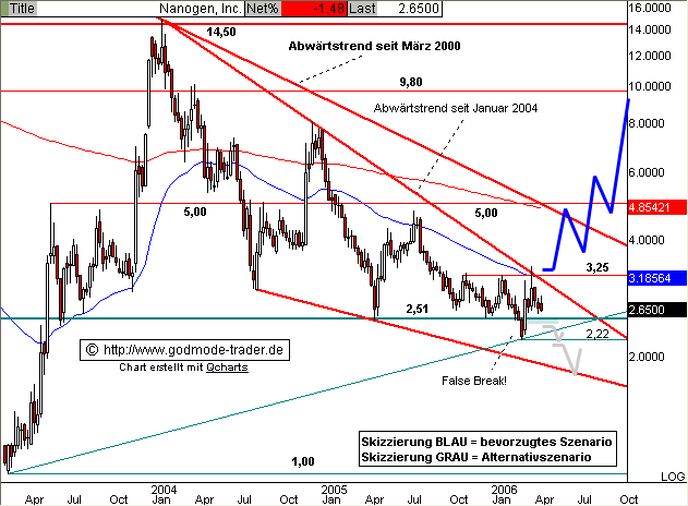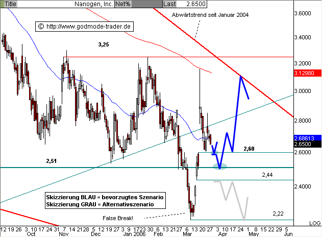 Rückblick: Die NANOGEN Aktie startete im März 2003 vom AllTimeLow bei 1,00 $ aus eine dynamische Kursrallye bis an den Horizontalwiderstand bei 14,50 $, wo im Januar 2004 eine ausgedehnte Korrekturbewegung ihren Anfang nahm. Dabei rutschte die Aktie Ende Februar 2006 unter die wichtige Horizontalunterstützung bei 2,51 $ zurück, konnte aber unmittelbar wieder darüber zurückkehren. So wurde nicht nur ein größeres Verkaufsignal abgewendet, sondern im Gegenteil mit dem Fehlausbruch ("False Break") ein Kaufsignal generiert. Nach einem Kurssprung bis an den Abwärtstrend seit Januar 2004 korrigiert die Aktie aktuell und nähert sich wieder der Horizontalunterstützung bei 2,51 $.