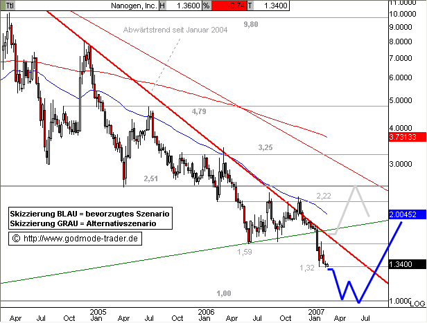 Kurz-Kommentierung: Die NANOGEN Aktie kippte nach einem Fehlausbruch über den Abwärtstrend seit Januar 2004 im Dezember 2006 wieder nach unten und vollzog den vermuteten Kursrutsch. Bei 1,32 $ stabilisiert sie sich aktuell, jedoch ohne Anzeichen einer Bodenbildung. Die 1,32 $ gilt nun als SELL Trigger, dessen Unterschreiten per Tages- und Wochenschluss eine finale Abwärtswelle bis zum mittelfristigen Abwärtsziel bei 1,00 $ einleiten sollte. Steigt die Aktie hingegen wider Erwarten per Tages- und Wochenschluss über den Abwärtstrend seit Januar 2004 bei aktuell 1,70 $ an, wird eine längere Kurserholung bis 2,22 - 2,51 $ möglich. Erst ein nachhaltiger Ausbruch über den Widerstandsbereich bei 2,22 - 2,51 $ hellt das übergeordnet deutlich angeschlagene Chartbild auf und löst ein Kaufsignal mit Zielen bei 3,25, 4,79 und 9,80 - 14,50 $ aus.