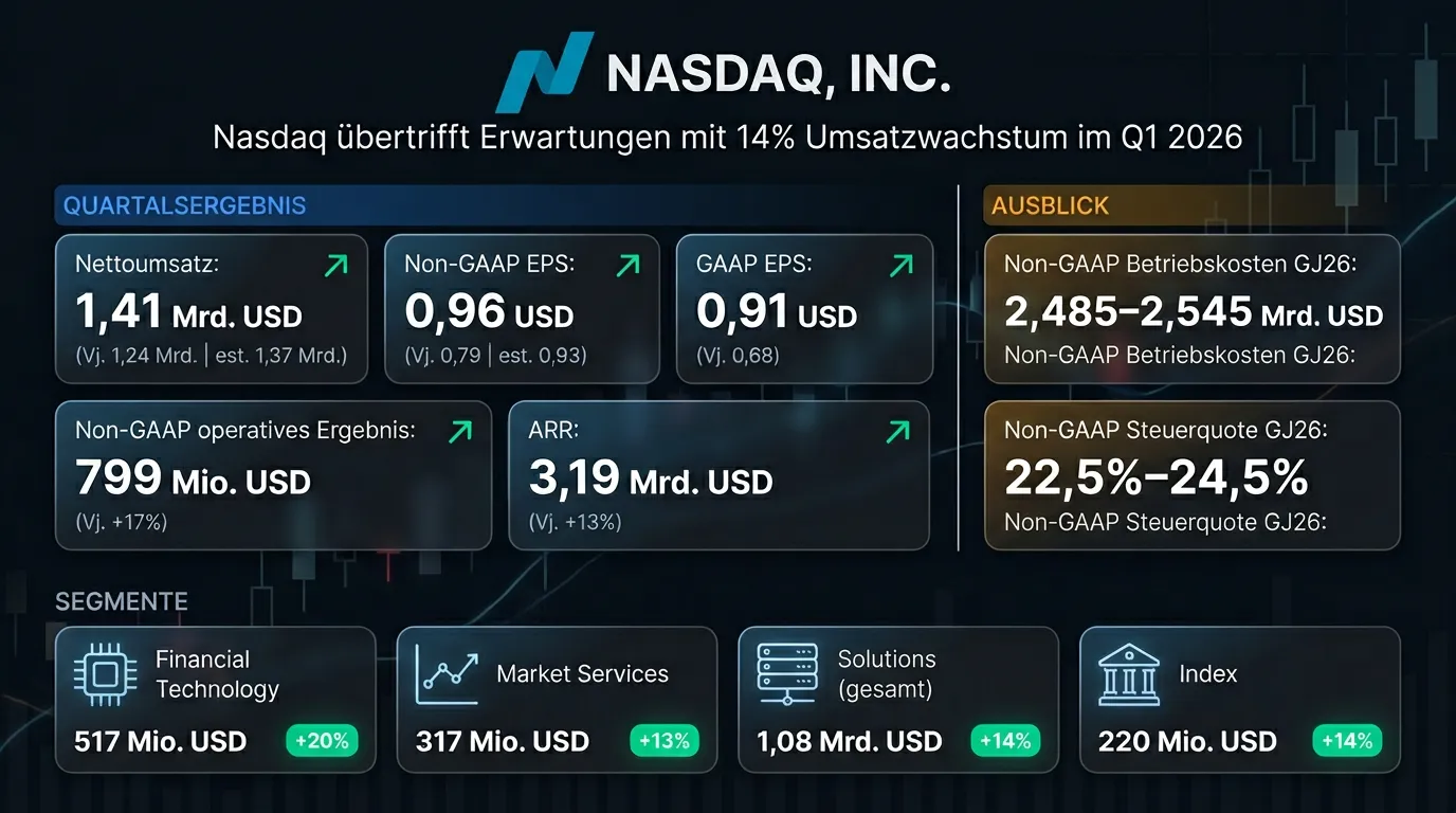 Nasdaq, Inc. hat im ersten Quartal 2026 einen Nettoumsatz von 1,41 Mrd. USD erzielt, ein Plus von 14% gegenüber dem Vorjahreszeitraum, und damit die Analystenerwartungen von 1,37 Mrd. USD übertroffen. Das Non-GAAP-EPS stieg um 22% auf 0,96 USD und übertraf ebenfalls die Konsensschätzung von 0,93 USD, während das GAAP-EPS um 33% auf 0,91 USD zulegte. Besonders stark zeigte sich das Segment Financial Technology mit einem Umsatzwachstum von 20% auf 517 Mio. USD. Im Quartal kehrte Nasdaq über 700 Mio. USD an die Aktionäre zurück, darunter rund 548 Mio. USD durch Aktienrückkäufe. Für das Gesamtjahr 2026 aktualisierte der Konzern seine Non-GAAP-Betriebskostenprognose auf eine Spanne von 2,485 bis 2,545 Mrd. USD.