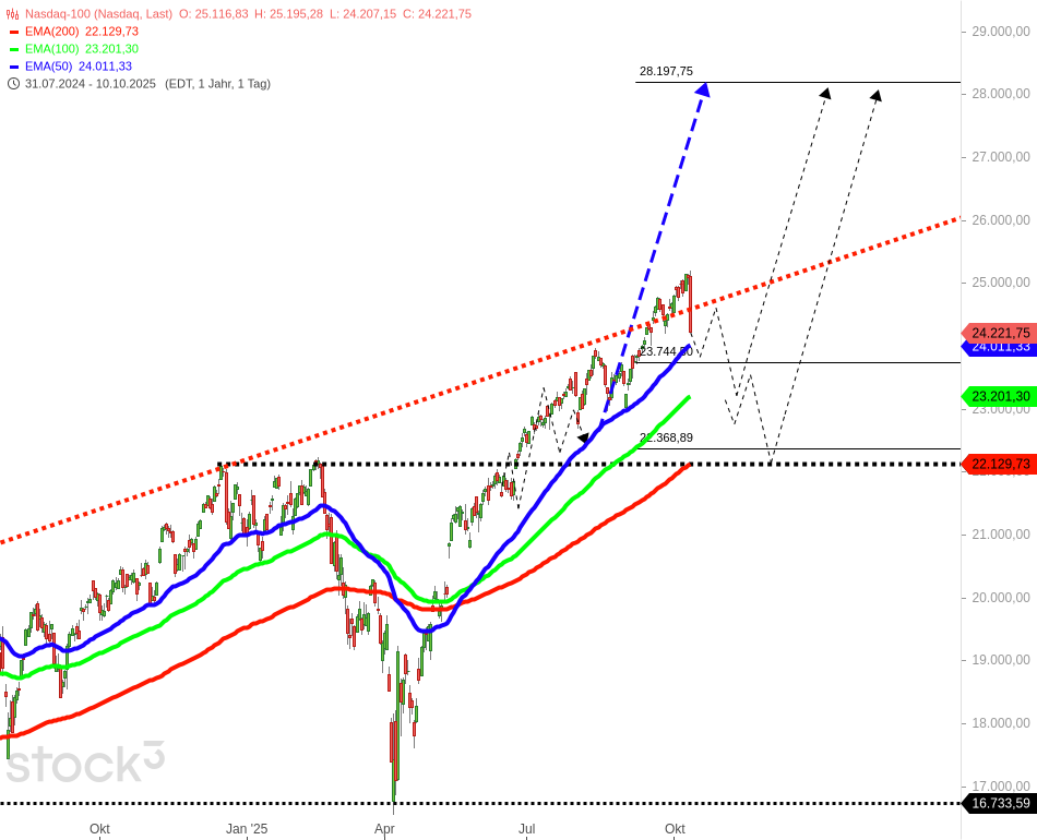 Die Kombination Zollansage und saisonal sehr schwache zweite Oktoberhälfte ist brisant. Der gestrige Sell Off muss in dem Kontext ernst genommen werden. Während des restlichen Oktobers kann sich die Unruhe fortsetzen und eine Abwärtskorrektur bringen. Unterstützungen, also Auffangnetze aus technischer Sicht, liegen bei ca. 24.000 Punkten (blauer EMA50), im Bereich von 23.200 Punkten (grüner EMA100) und bei 22.129 Punkten (roter EMA200). Es gibt auf dem Weg nach oben, seit gestern also einige Umwegszenarien untenherum. Entsteht ein großes bärisches Top ? Meiner Meinung nicht. Was wir sehen, ist eine Zwischenkorrektur.